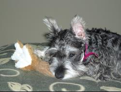 Toby joined us in the summer of 2019 with the hope of getting a schnauzer puppy to "learn good habits" from Chloe. It was a good plan that Kalie had, but Toby may be a little too strong willed for that! He is definitely "all boy" as Kalie likes to say!